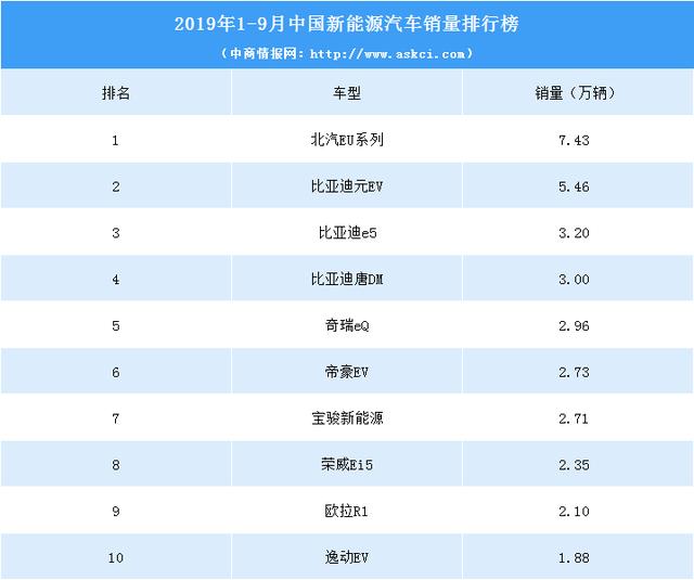 企业方面,2019年1-9月,新能源乘用车销量第一的车型为北汽EU系列,销量为7.43万辆,同比劲增484.6%。排名前十的车型依次为北汽EU系列、比亚迪元EV、比亚迪e5、比亚迪唐DM、奇瑞eQ、帝豪EV、宝骏新能源、荣威Ei5、欧拉R1、逸动EV。其中,除了北汽EU系列以外,比亚迪元EV、宝骏新能源、逸动EV涨幅同样超100%,奇瑞eQ则出现下滑。