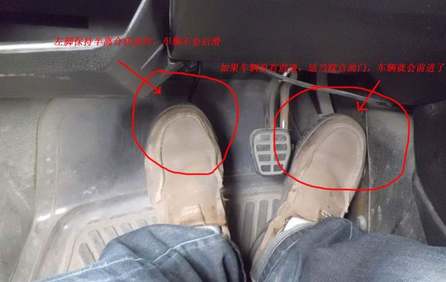 我们先回顾下驾校是怎么教陡坡起步的,拉起手刹,踩下离合,挂一档。踩下油门2cm以上,同时抬离合,这时眼睛看车头,当车头微微抬起(作用力反作用力原理)时放下手刹。如果还有轻微溜车就多给点油,多抬点离合。车子就走了-----这是驾校标准动作,你可以先在平地上试试。