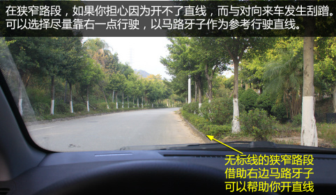 狭窄路靠右开 以右边马路牙子为参考