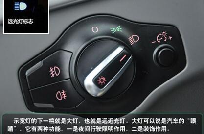 示宽灯的下一档就是大灯,也就是远近光灯。它的主要作用是汽车行驶时照明,原车的远近光不可以同时打开,也就是远近灯光的切换,切换手柄在方向盘左下侧,上下拨动可以切换远近光。经改装了的灯,打开近光时近光亮,打开远光时远近光同时亮。