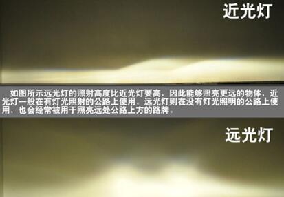 如图所示远光灯的照射高度比近光灯要高,因此能够照亮更远的物体,近光灯一般在有灯光照射的公路上使用。远光灯则在没有灯光照明的公路上使用,也会经常被用于照亮远处公路上方的路牌。