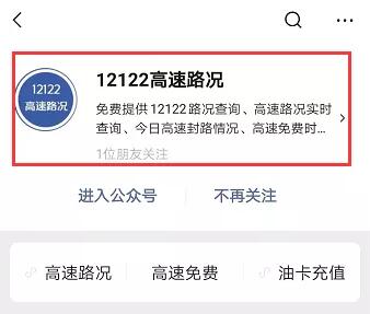 首先,搜索:【12122高速路况】找到对应的公号,(或者点本文标题下方 蓝字或文末二维码都可关注)