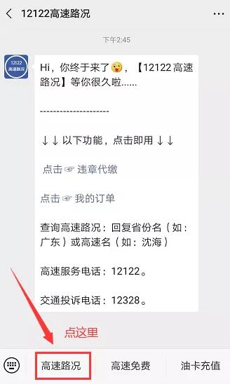 一、进入公众号界面,点击左下角底部菜单【高速路况】