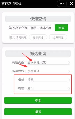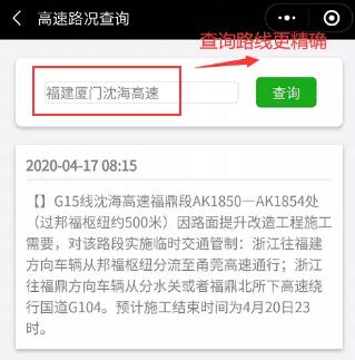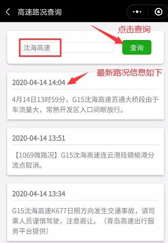 关注成功后,直接底部菜单回复:省份名或高速名,即可获取当前高速最新路况实时播报以及封路信息播报,比如输入广东或沈海,如下图: