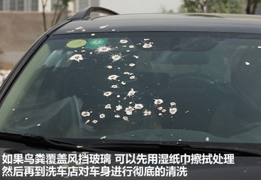 提醒,将车身上覆盖的鸟粪清除掉后,最好能用清洗液再擦拭一遍,确保将带有腐蚀性的鸟粪残余物质彻底去掉。此外,对于粘得很牢的鸟粪千万不要硬抠,以避免鸟粪残渣进入指甲缝里。在车窗上坚硬的鸟粪也不要用雨刮器强行刮扫,以免加速雨刷橡胶条的老化,最好还是有耐性地多用些清洗液或清水浸泡润湿。