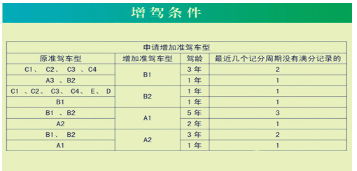 1、申请增驾中型客车准驾(B1)的,原准驾车型C1、C2、C3、C4(驾龄)必须在三年以上,并且两年内无记满12分的;原准驾车型A3、B2(驾龄)必须在一年以上,并且一年内无记满12分的,年龄(24至50周岁)。