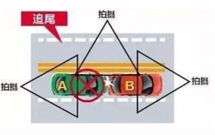 追尾事故,双方驾驶员在车头,拿照相机或者手机,在车头位置把两车的全貌,包括路上标线的情况,全部都要反映出来。这是一张,然后在车后往相反方向,再拍一张,在两车相撞的,接触部位、撞击部位,再拍一张局部照,一般情况就可以了。